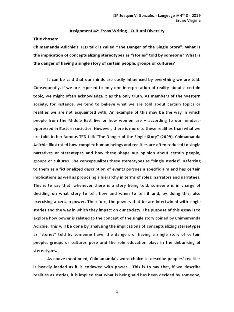 In this ted talk, a nigerian author, chimamanda adichie, warns against listening to only one side of a story as it leads to misconceptions about a particular people or nation. Download as docx, pdf, txt or read online from scribd. It will be published on monday 12th october 2009. Growing up in nigeria she started reading only european literature and she began writing stories only about whites. In chimamanda adichie's ted talk, danger of a single story, the novelist examines the problematic nature of a single narrative.